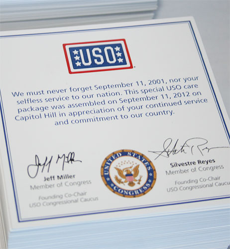 “We must never forget September 11, 2001, nor your selfless service to our nation. This special USO care package was assembled on September 11, 2012 on Capitol Hill in appreciation of your continued service and commitment to our country,” the cards read.