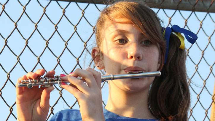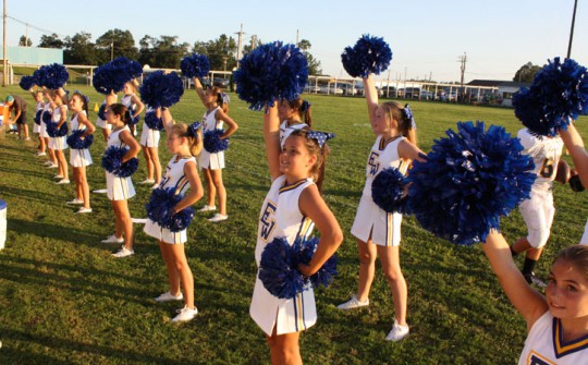 Pictured top: Desmone Knight picks up yardage for Ernest Ward Thursday evening against Perdido in Walnut Hill. Pictured top inset: Quarterback Luke Ward completes a pass. Pictured bottom inset: Dustin Beathea on the run for the Eagles. Pictured below: The Ernest Ward Middle School cheerleaders. Pictured bottom: Kylie Brook on the piccolo in the Ernest Ward band. NorthEscambia.com photos, click to enlarge.