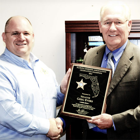 The Florida Sheriff’s Association has presented their Legislative Champion Award for 2012 to Sen. Greg Evers (R-Baker). Evers currently serves as chairman of the Criminal Justice Subcommittee.