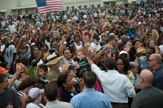 Pictured top: Barack Obama campaigns in St. Petersburg, Florida, on Saturday. Pictured inset: Mitt Romney campaigns Saturday in Virginia. Courtesy photos for NorthEscambia.com, click to enlarge.