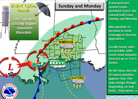 - Sunday Night: Mostly cloudy. Numerous showers and thunderstorms. Near steady temperature in the lower 70s. Southeast winds 5 to 10 mph. Chance of rain 60 percent.