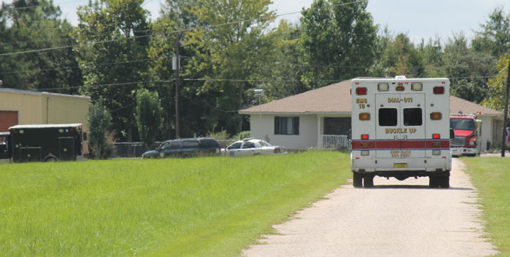 Pictured top: Investigators remained on scene for hours after the Escambia County (Ala.) Sheriff was shot Friday morning at this home in Flomaton. Pictured top inset: Sheriff Grover Smith. Pictured bottom inset: The shooting scene. Pictured below: An Escambia County (Fla.) EMS unit arrives at the scene Friday morning. NorthEscambia.com photos, click to enlarge.