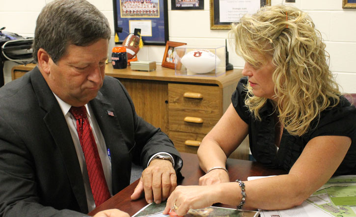 Pictured top: Escambia School Superintendent Malcolm Thomas and Ernest Ward Principal Nancy Perry discuss options for the new school. NorthEscambia.com file photo, click to enlarge.