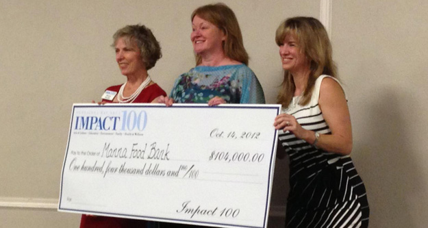 Pictured: Manna Food Bank Executive Director DeDe Flounlacker (center) receives a $104,000 check from Impact 100 Sunday. Courtesy photo for NorthEscambia.com, click to enlarge.