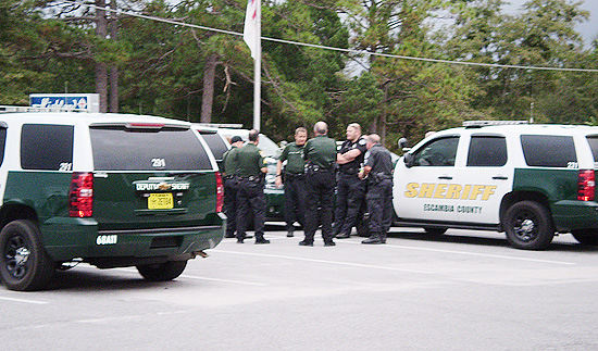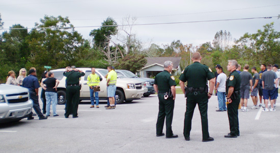 Pictured above and below: Deputies and volunteers plan their course of action before an Operation Clean Sweep gets underway Thursday morning at Highland Baptist Church in Molino. Photos for NorthEscambia.com, click to enlarge.