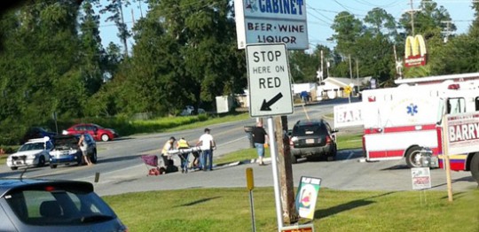 Pictured top and inset: One person was injured in this single vehicle rollover accident on Jacks Branch Road Saturday night. NorthEscambia.com photo by Kristi Smith, click to enlarge. Pictured below: An accident just before 5 p.m. Saturday at Old Chemstrand Road and Highway 29 in Gonzalez. Reader submitted photo by Emily Gudell for NorthEscambia.com, click to enlarge.