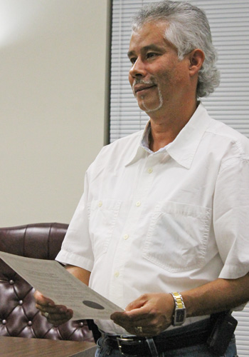 The Town of Century presented a proclamation Monday night to resident César González, who recently became a U.S. citizen and almost immediately registered to vote. González is a native of Colombia, South America, and has been in the United States for nine years. He and his wife, Century Town Clerk Leslie Gonzalez, moved to Century in 2010. His path to citizenship took seven years. NorthEscambia.com photos, click to enlarge.