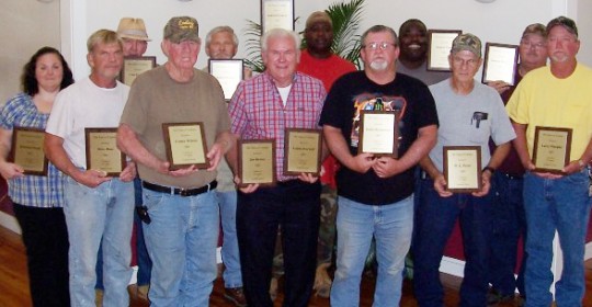 Pictured are: (front, L-R) Steve Ross, 22 years; Comer Wilson, 16 years; Mayor Freddie McCall; Eddie Hammond, 30 years; W.L. Tyree, 22 years; Larry Murphy, 30 years; (back, L-R) Kristina Wood, 11 years; Carl Godwin, 22 years; Robert Powell, 15 years; Sedrick Lowery, 10 years; Robert Tims, 24 years; Donnie Waters, 21 years. Not pictured: Louise Harwell, 20 years, and Joe Brown, 22 years. Courtesy photo for NorthEscambia.com, click to enlarge.