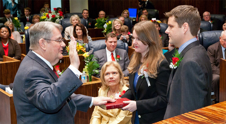 Pictured top: Senate President Don Gaetz (left) is sworn in Tuesday. Pictured inset: Gaetz addresses the Senate. Submitted photos for NorthEscambia.com, click to enlarge.