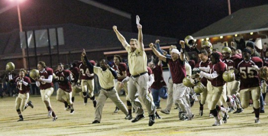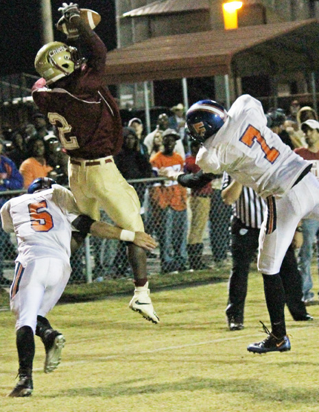 Pictured top: Northview quarterback Kevin Vaughan gains yardage for the Chiefs Friday night in Bratt. Picture top inset: Neino Robinson reaches for a pass. Pictured bottom inset: La’Mikal Kyles catches a pass. Pictured below: The Chiefs celebrate a regional championship. NorthEscambia.com photos, click to enlarge.