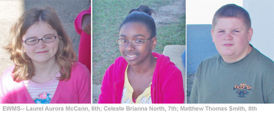 - Ernest Ward Middle — Laurel Aurora McCann, sixth; Celeste Brianna North, seventh; Matthew Thomas Smith, eighth
