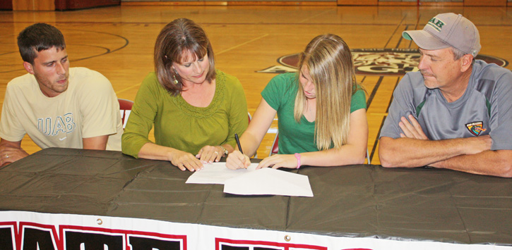 Pictured: Tate senior Amy Waters signs a letter of intent with the University of Alabama at Birmingham as her parents, Kirk and Cindy Waters, and her brother, Jace Waters, look on. Submitted photo for NorthEscambia.com, click to enlarge.