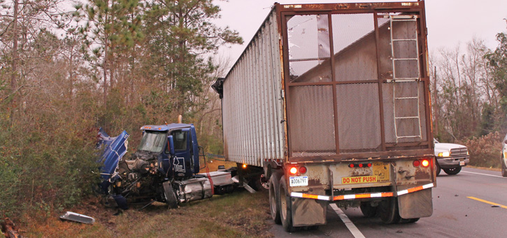 Pictured: A wreck involving an 18-wheeler and a pickup truck closed Highway 97 in Molino for hours this morning. NorthEscambia.com photos, click to enlarge.