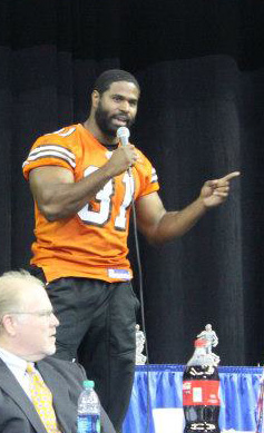 Pictured top: Challenger Award winner Jeremy Gibbs from Jay High School. Pictured inset: Former Cleveland Browns running back William Green addresses the FCA banquet Monday night at the Pensacola Civic Center. Submitted photos for NorthEscambia.com, click to enlarge.
