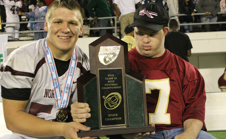 Pictured top: Toby Weaver holds the Northview Chiefs Class 1A state football championship trophy on the way back from Orlando, courtesy photo. Pictured below: Logan Weber (left) and Toby Weaver pose last Friday night with the trophy. Pictured bottom: Toby Weaver (bottom right, No. 7 garnet jersey) poses with his Chiefs and the state championship trophy. Pictured inset: Toby Weaver runs onto the field at Orlando’s Citrus Bowl last Friday night. Northescambia.com photos, click to enlarge.