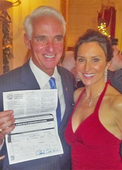 Also, Crist posted a photo that showed him holding up the signed registration form, while his wife, Carole, smiled. The Tampa Bay Times reported that Obama celebrated the change with a fist bump.