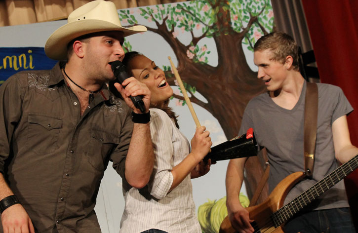 Kellie Gindl (center) of Barrineau Park plays a cowbell on stage with The Springs’ lead singer Stewart Halcomb (left) and guitarist Steven Pettry Saturday night during the Northview FFA Alumni Blue Jacket Jamboree in Bratt.