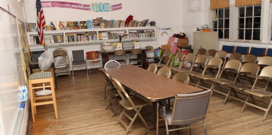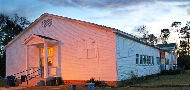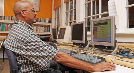 Pictured top: The sun sets recently on the Carver Community Center on Jefferson Avenue in Century. Pictured inset: One of the classrooms inside the aging building. Pictured below: Carver Community Center Association board member Henry Hawkins tries to demonstrate reading software used by the center to teach children, but the aging computer malfunctioned. NorthEscambia.com photos, click to enlarge.