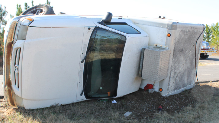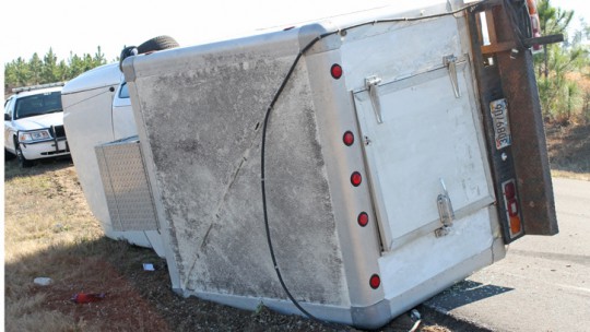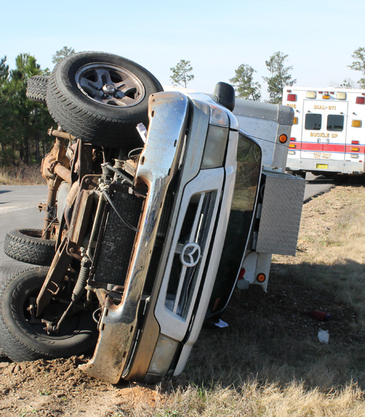 The driver of a refrigerated seafood truck apparently ran off the road, lost control and overturned on North Pine Barren Road just south of Highway 168. The driver had fled the scene before first responders arrived.