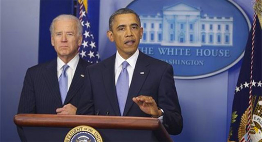 Pictured: President Barack Obama, with Vice President Joe Biden (left), makes statement after passage of fiscal cliff bill Tuesday night. Courtesy photo for NorthEscambia.com, click to enlarge.
