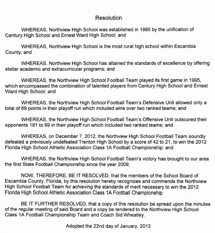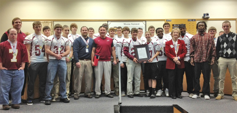 Pictured: The Northview Chiefs were congratulated on their state football championship by the Escambia County School Board Tuesday night. Courtesy photo for NorthEscambia.com, click to enlarge.