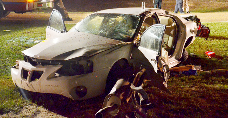 Picture top and inset: A Molino man died in this 2010 crash after he hit a guardrail on approach to Jacks Branch Road and plunged into a creek. Pictured below: One person was injured in this October 2012 accident on Jacks Branch Road near Perdido Lake Road. NorthEscambia.com photos, click to enlarge.