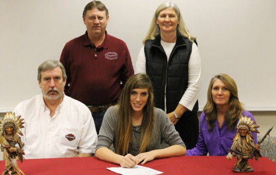 Pictured: Misty Doran signs with Wallace State Tuesday morning at Northview. Looking on are her parents, Jerry and Suzanne Doran (seated), recruiter Freddie Kirby of Southeastern Athletics and Wallace State Coach Jayne Clem. NorthEscambia.com photo, click to enlarge.