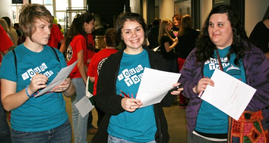 EREC Youth Tour delegates with Representative Clay Ingram. (L-R) Garrett Peirce, Dylan Wolfe, Chassity McCranie, Victoria Wright, Dakota Mack, Representative Clay Ingram, Tate Upton, Kayla Flowers, Kayne Caraway, Taylor Brook and Shelena Dukes. Pictured inset: Tate Upton enjoys the batting cage at Tallahassee’s Fun Station. Submitted photos for NorthEscambia.com, click to enlarge. Pictured below: The group with Sen. Greg Evers. Pictured bottom: Taylor Brook, Victoria Wright, and Shelena Dukes look for clues to the scavenger hunt in the Challenger Learning Center.