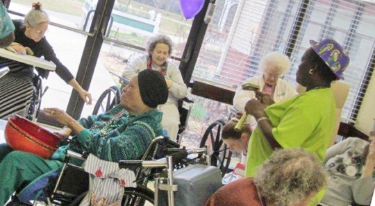 The parade featured lots of throws, including Mardi Gras beads and other trinkets. Residents in Mardi Gras costumes paraded and rolled through the hallways in their wheelchairs to the delight of other residents watching the parade.