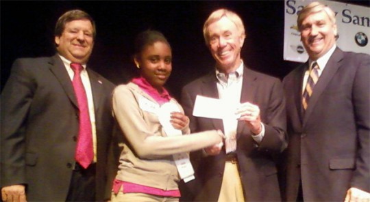 Pictured: Sandy Sansing presents a check to Dadrien Washington along with Escambia County Superintendent Malcolm Thomas (left) and Santa Rosa Superintendent Tim Wyrosdick (far right). Submitted photo for NorthEscambia.com, click to enlarge.