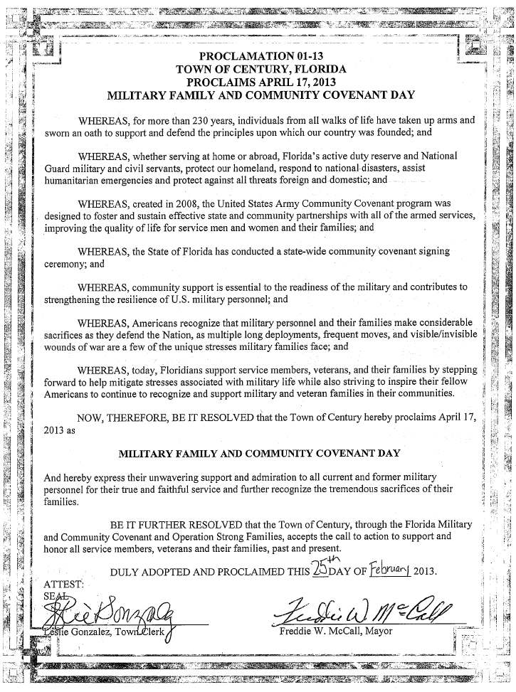 The Town of Century has declared April 17 as Military Family and Community Covenant Day, joining cities across Florida and the state in the effort.