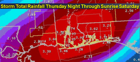 A flash flood watch is in effect into Saturday morning for the entire area. Rainfall through Friday night is expected to range from 2-4 inches over much of the area, with up to 6 inches possible where storms repeatedly move across the same locations.