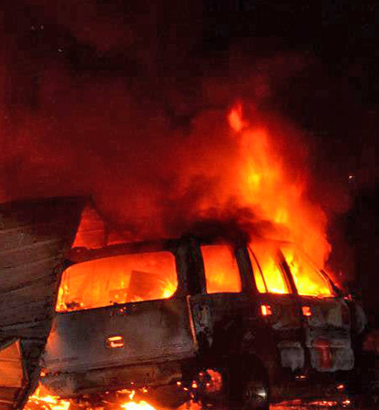 Pictured above and below Fire destroyed a large detached garage near Barrineau Park early Tuesday morning. Pictured inset: A vehicle burns along with the garage. NorthEscambia.com photos by Kristi Smith, click to enlarge.