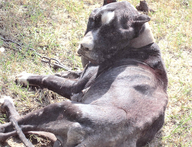 “I first observed a very skinny brown pit bill dog tied to a large chain barking at me,” one deputy wrote in his report. “I then observed a very skinny black pit bull dog lying on its side, and it appeared to be dead…I observed the black dog lift its head and look at me though due to the dog being so skinny from lack of food, the dog could not stand up.”