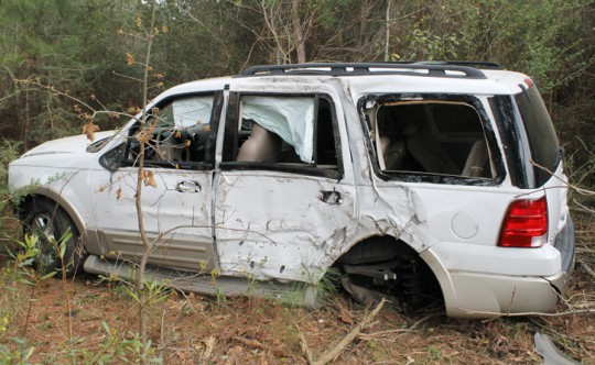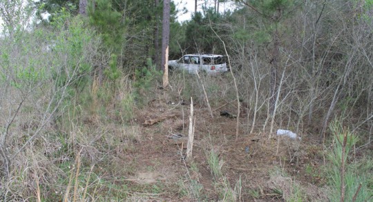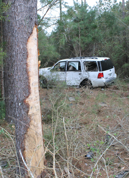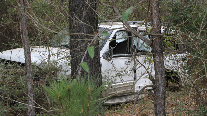 A passerby spotted the wrecked Ford Expedition about 7:15 a.m. in a wooded area on Highway 97 just north of Tungoil Road. There was no one around the vehicle; the wreck had apparently happened sometime overnight.