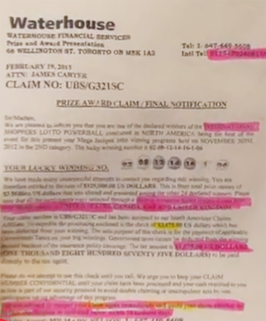 He called the Canadian 647 area code number on the letter and was told by a man with foreign accent that he was a winner selected in the International Shoppers Lotto Powerball conducted in North America. He was to cash the check in order to pay $1,875 in taxes on his winnings.