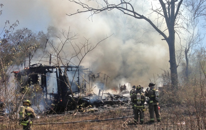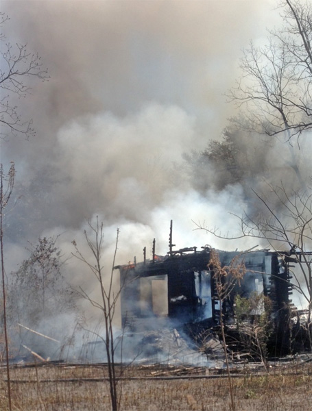 Fire consumed two abandoned structures on Cobb Lane this afternoon, just north of the I-10 and Highway 29 interchange. The fire reportedly started when an abandoned trailer was being demolished and the flames spread to another structure. The fires are under investigation by the State Fire Marshal’s Office NorthEscambia.com photos by Kristi Smith, click to enlarge.