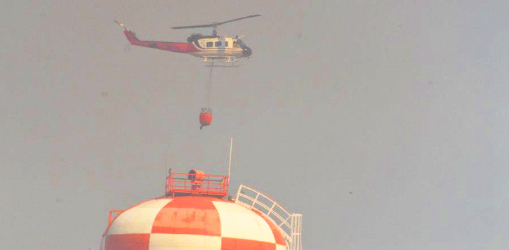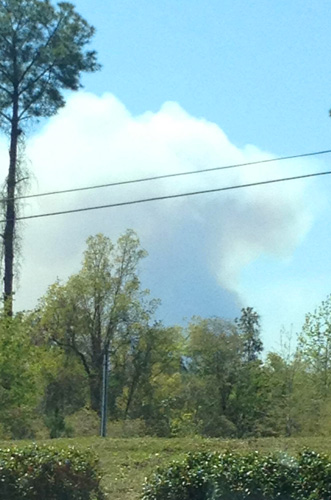 Pictured top: A Forest Service Bell UH-1H helicopter was used to control the blaze. Pictured inset: A huge plume of some from the fire as seen from the 9 Mile Road area. NorthEscambia.com photos by Kristi Smith, click to enlarge.