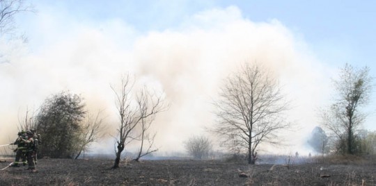 Pictured top: An uninhabited house on McBride Road was fully involved when firefighters arrived on scene as scene in this reader submitted photos.. Pictured inset and below: A resulting brush fire consumed about eight acres and threatened four other structures. NorthEscambia.com photos, click to enlarge.