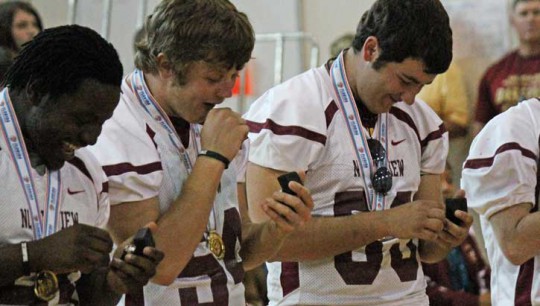 Pictured top: Northview Chiefs Kahlil Grice, Ryan Lambert and Justin Halteman react upon seeing their state championship rings for the first time Monday afternoon. Pictured below: The District 1A State Champion Northview Chiefs. NorthEscambia.com photos, click to enlarge.