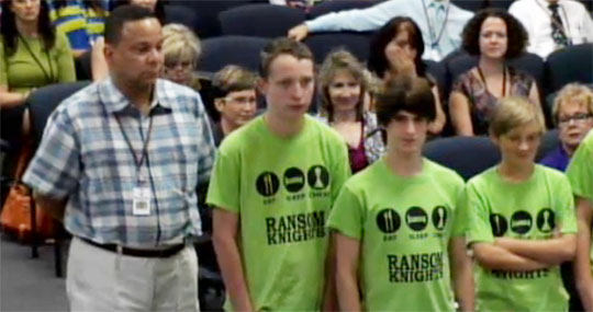 Pictured top: Ransom Knights sponsor John Lowe with team members at Tuesday night’s Escambia County School Board meeting. Pictured inset: Superintendent Malcolm Thomas (right) and board member Bill Slayton presented the group’s trophy. Pictured below: The Ransom Knights chess team. Courtesy images for NorthEscambia.com, click to enlarge.