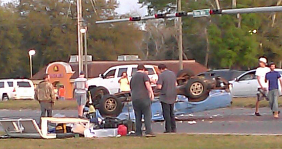 Pictured: The driver of this pickup, which came to rest upside down, was charged with running a red light Tuesday evening at Nine Mile and Chemstrand roads. Reader submitted photo, click to enlarge.