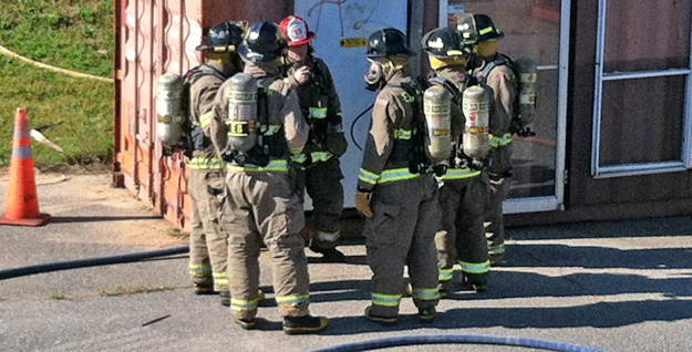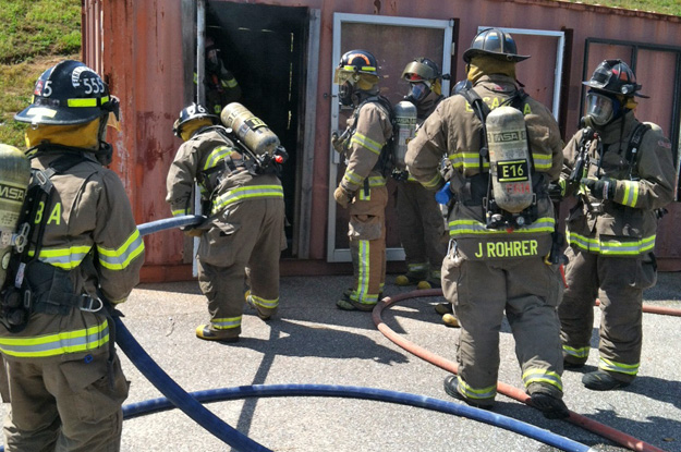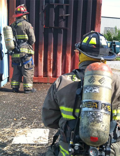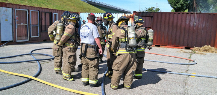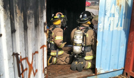 Above: Lt. Matt Scallan (red helmet) gives instructions to students prior to entering the “burn can”.