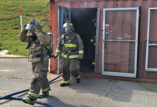 Pictured top: Firefighter I class members Saturday at a Live Fire Training Class in Pensacola. Pictured inset: Lt. James Shaw (left) and Firefighter Jason Felicelli serve as a Rapid Intervention Team to handle any emergency during the training.