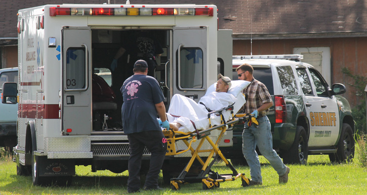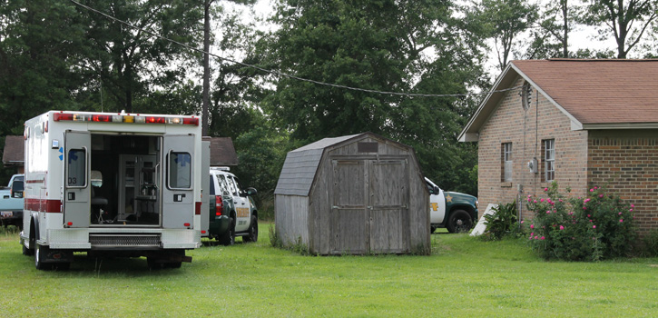 Pictured top: Burglary suspect Ricky Taylor, shot in the leg, is loaded into an ambulance on Rockaway Creek Road Friday afternoon. Pictured inset and bottom: Taylor is transferred to LifeFlight. Pictured below: The scene of an alleged burglary that ended with the suspect being shot Friday afternoon in Walnut Hill. NorthEscambia.com exclusive photos, click to enlarge.