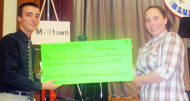 Jonathon Rogers received a $1,000 academic scholarship from the Barrineau Park Historical Society. He plans to pursue a career in the medical field. Presenting the check is Andrea Byars, one of the first BPHS scholarship winners.