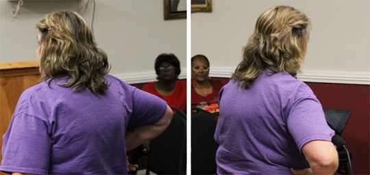 Pictured top: Gayle Aldridge of 9032 North Century Boulevard turns away from the Century Town Council Monday night in an apparent attempt to avoid being photographed. Pictured below: Aldridge continues to hide her face in an apparent attempt to avoid being photographed as she exits the council chambers Monday night. Pictured inset: Aldridge looks at the camera during a May 6 Century Council meeting. NorthEscambia.com photographs, click to enlarge.
