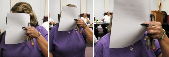 Following McCall’s presentation Monday night, Aldridge began to address the council. As she spoke, she continually turned away from the council and our NorthEscambia.com camera, hiding her face from our photographer and speaking with her back to council members. Aldridge called NorthEscambia.com’s publisher a “crook” , before turning away from the council and walking out of the council chambers, covering her face with paper apparently attempting to avoid being photographed.