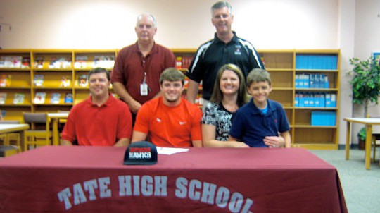 Tate High School senior Chris Shelby has signed a football scholarship to play at Huntington College in Montgomery. Pictured are (bottom, L-R) Kenneth Shelby, Chris Shelby, Tami Shelby, Caleb Shelby (top, L-R) Dean David Venettozzi and Principal Rick Shackle,. Submitted photo for NorthEscambia.com, click to enlarge.