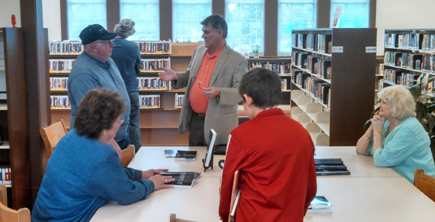 Pictured top: (L-R) Sean Kahalley and Andrew Cross of the Molino Branch Library, and Baby Blue author Lloyd Albritton. Pictured: Albritton held a book signing a the library on Saturday. Submitted photos for NorthEscambia.com, click to enlarge.